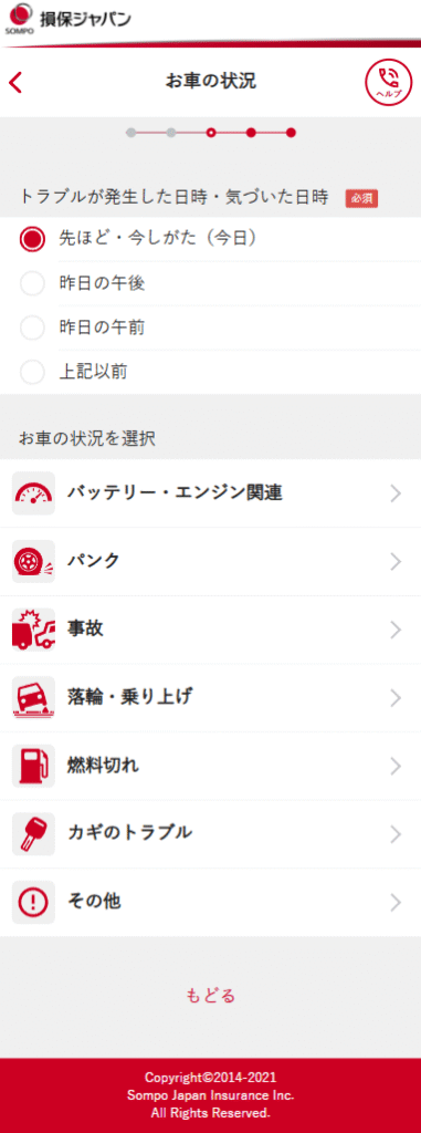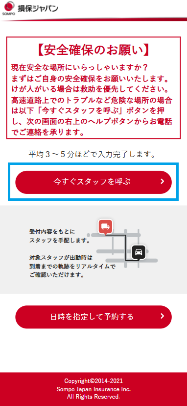 ロードアシスタンス専用デスクへ電話をかけ、自動音声より「WEBサイトによる受付」を選択し、SMS(ショートメッセージ)で送信されるURLからアクセスできます。